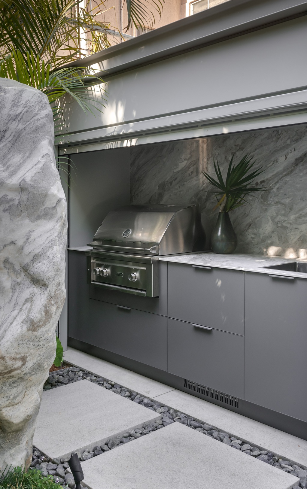 The second kitchen is positioned inside a recessed niche that can be opened or closed as needed. It serves as the main cooking area with a grill, sink, cooling drawers, and freezer.