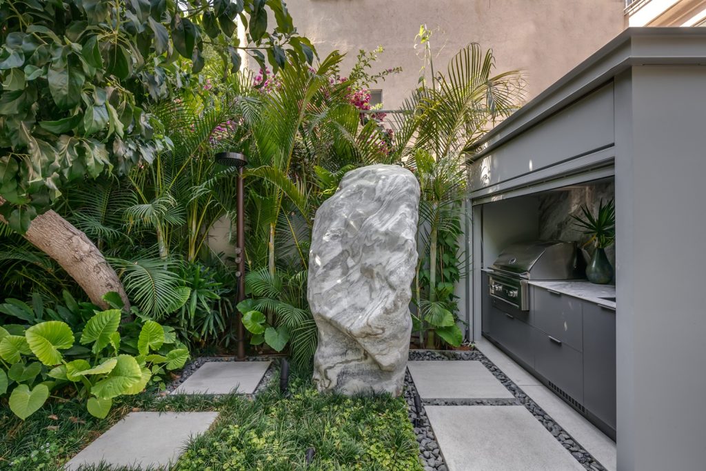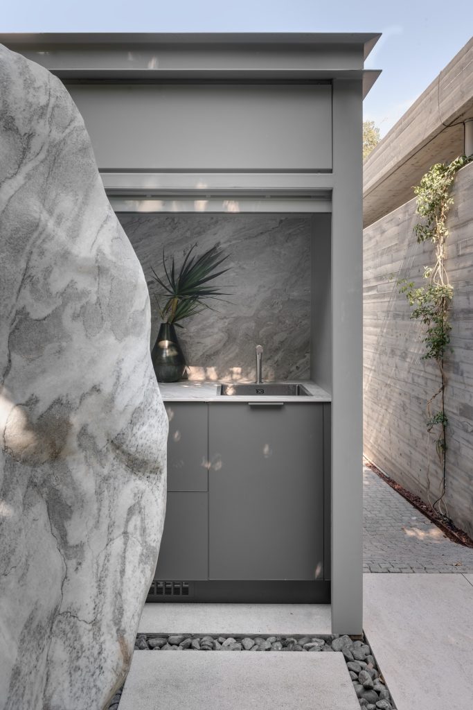 The first is a custom designed kitchen that blends naturally into the landscape, equipped with a wood-fired oven, refrigerator, and gas cooktop.