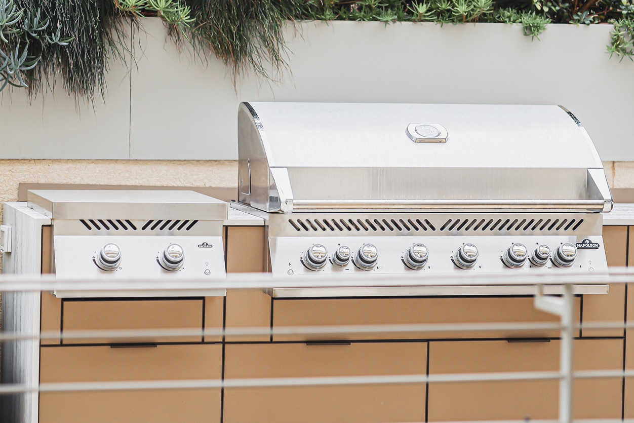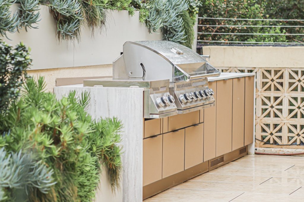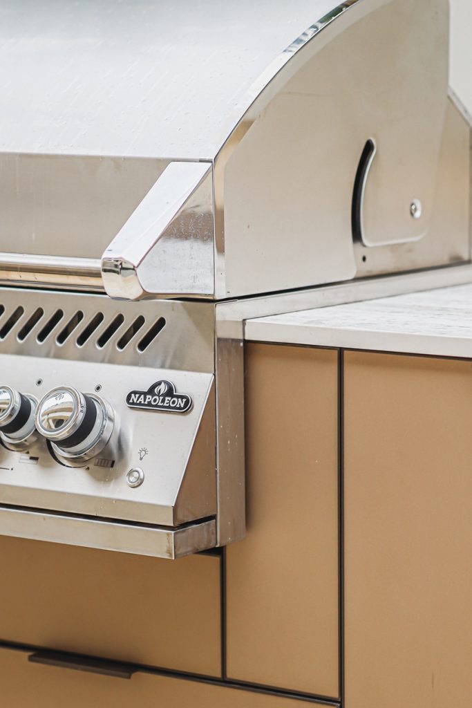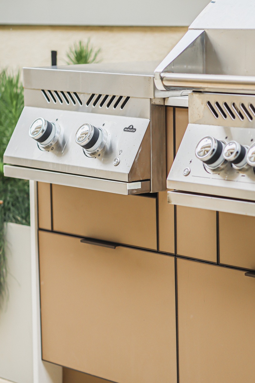 מטבח חוץ צמוד קיר אלגנטי בקו נקי ומודרני, המשלב גריל גז מקצועי, כירת צד, מקרר וכיור. חזיתות בגוון קפוצ’ינו המעניקות למטבח מראה יוקרתי ורך, בעוד השילוב עם משטח הבהיר יוצר קונטרסט מדויק.