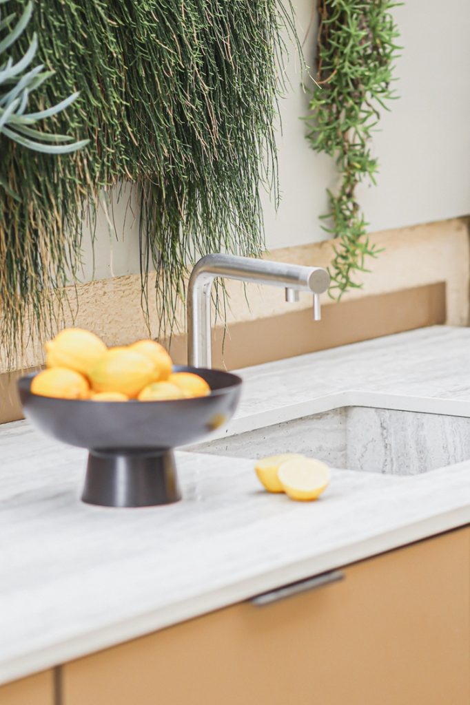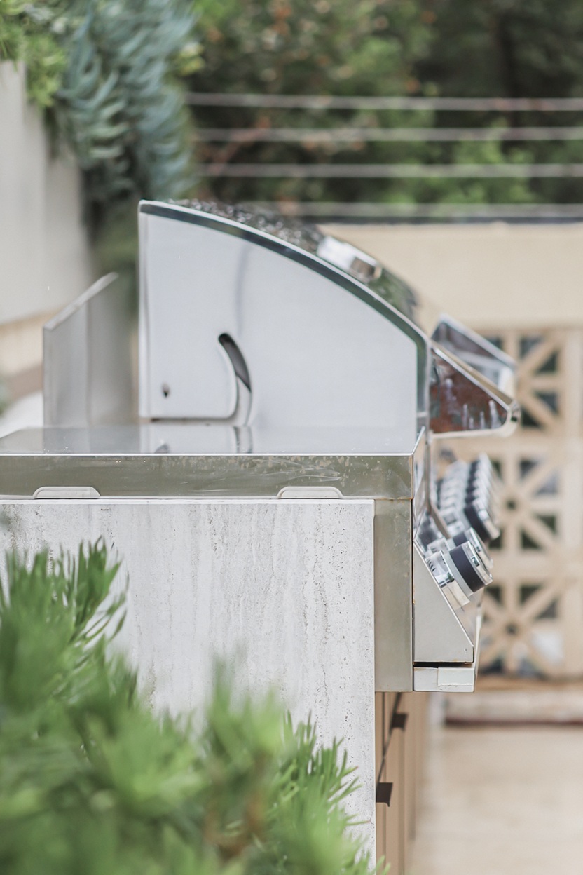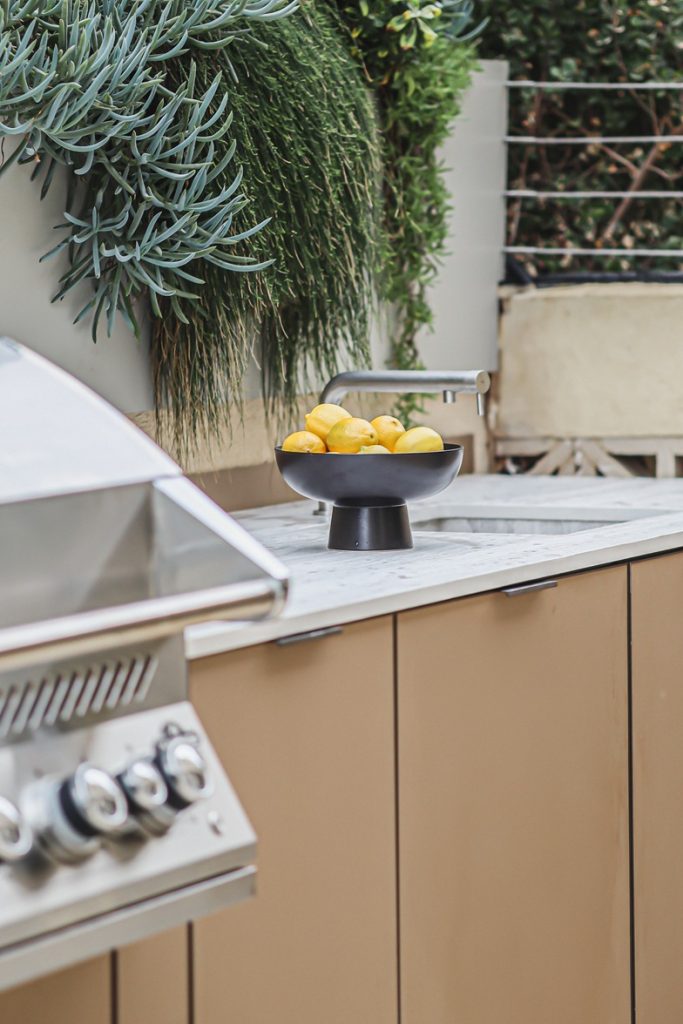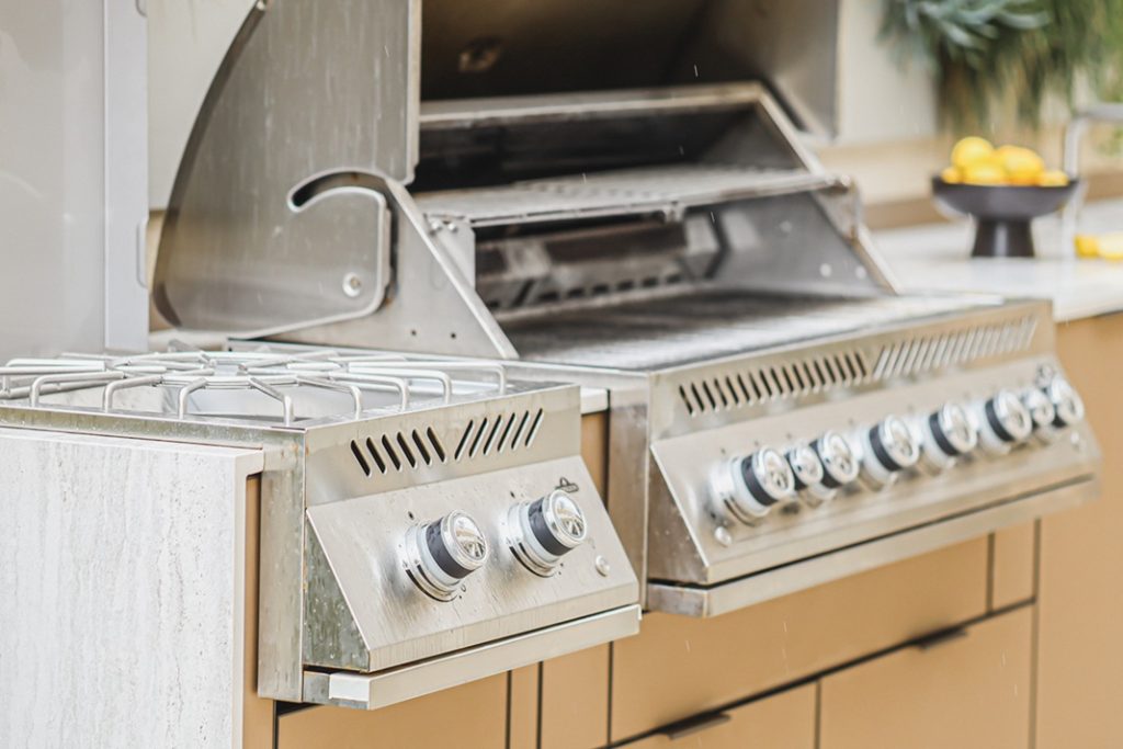 מטבח חוץ צמוד קיר אלגנטי בקו נקי ומודרני, המשלב גריל גז מקצועי, כירת צד, מקרר וכיור. חזיתות בגוון קפוצ’ינו המעניקות למטבח מראה יוקרתי ורך, בעוד השילוב עם משטח הבהיר יוצר קונטרסט מדויק.